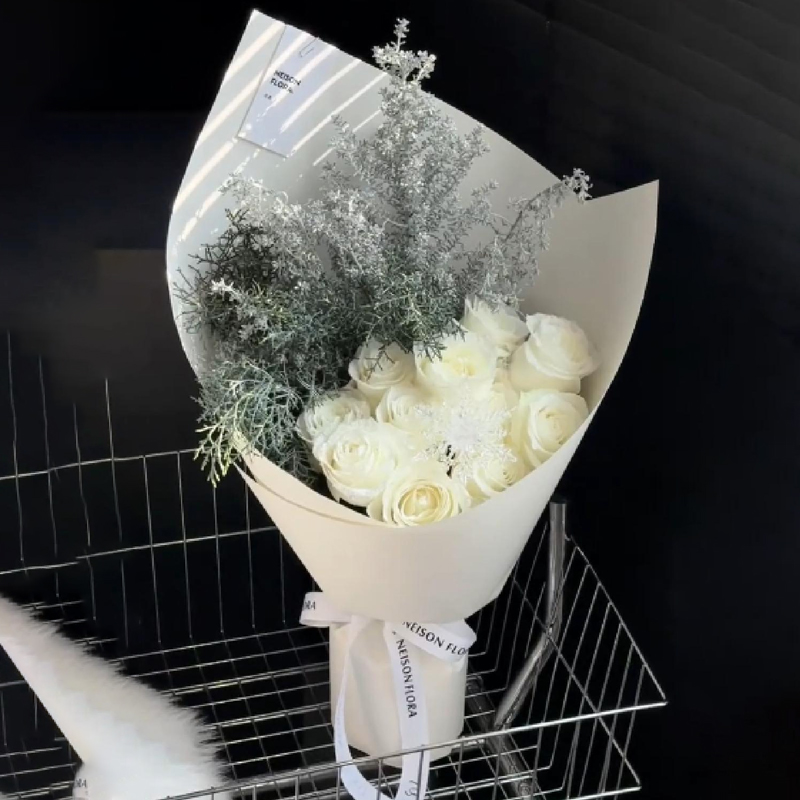 This bouquet features pure white roses paired with silver frosted foliage, creating a sleek and luxurious visual vibe. Wrapped in high-quality off-white paper and tied with a matching printed ribbon, its minimalist and elegant style makes it a perfect gift for birthdays, proposals, or daily surprises—adding a touch of sophisticated ceremony to any occasion.